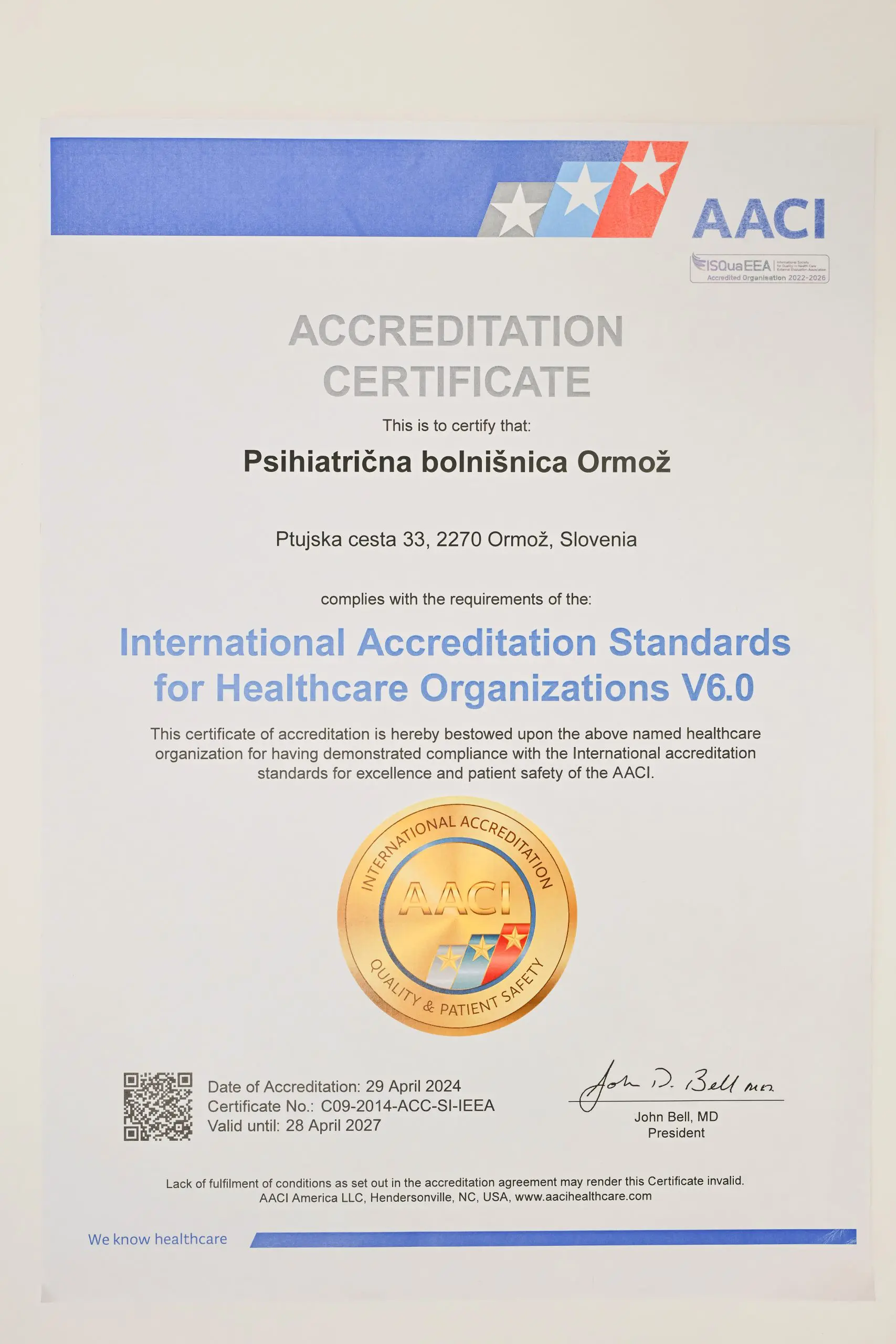 V Psihiatrični bolnišnici Ormož kakovost in varnost obravnavamo kot stalno zavezo. Naš cilj je zagotavljati varne in strokovne storitve, prijazno in varno okolje za uporabnike ter hkrati izboljševati tudi ekonomsko učinkovitost poslovanja. Že leta 2012 smo pristopili k projektu celovite kakovosti. Leta 2015 smo uspešno opravili akreditacijsko presojo in pridobili certifikat AACI, standard ISO 9001:2008 ter standard EN 15224:2012. Aprila 2024 smo ponovno opravili zunanjo presojo po mednarodnem standardu EN 15224:2016 (zdravstvene storitve – sistemi vodenja kakovosti v skladu s standardom ISO 9001) ter po ameriški akreditacijski organizaciji AACI.
